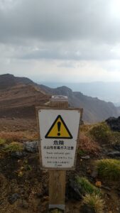 そして火山ガスに注意の看板も。なんだか昨日の久住山のお気楽観光登山とは全然違う…。
