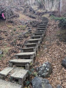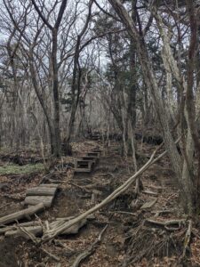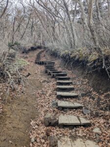 の言葉をここで知ります。もうここからはずっと階段、20段ぐらい上がってちょっと休んでを繰り返して息切れしながらもなんとか進みます。当然(?)先ほどの男女グループにも抜かれ、しばらくはグループの姿を見ながら後追いぐらいのペースでしたがだんだん一人二人と見えなくなり、単独登山となってきます。