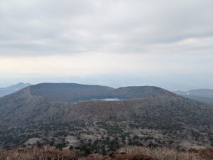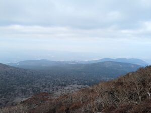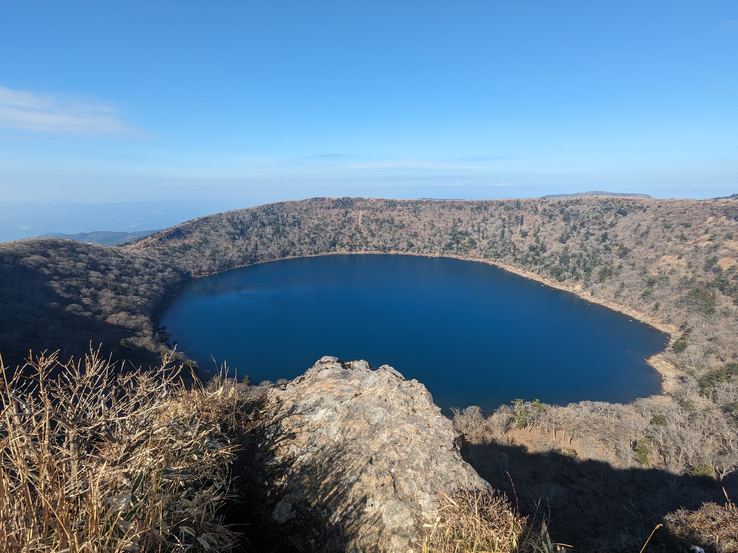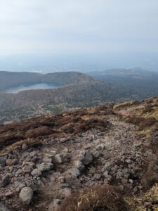 避難小屋の分岐で少しだけ休憩して今度は大浪池側へ。大浪池は火口にできたカルデラ湖なので周りを一周するルートがあるのですが、今回は時間のこともあるので分岐から展望台までの往復ルートとしました。避難小屋からは少し岩がありますが歩きやすい登山道が続きます。11月なので葉っぱが落ち切ってしまってましたが、紅葉の時期だったらすごくきれいだったのかもしれません。