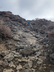 標高上がり、あと山頂まで500mぐらいになると階段が無くなりちょっとした岩場になってきます。岩場ですが、昨年登った阿蘇の仙水峡ルートを経験した後なのでそれほど驚くことなく登っていきます。負傷した右親指が若干気になりましたが四足歩行になるような急斜面はありませんでした。