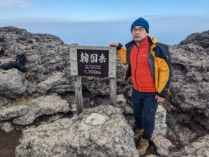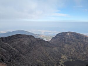 満面の笑顔でと思いましたが、山頂は風が強くてやっぱり寒く、顔が引きつってますね(笑)。山頂といっても火口の淵といった場所なので登りの斜面とは逆側はえぐれた崖のような状態になってます。