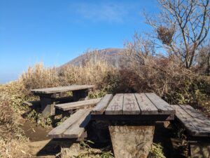 ちょうど隙間になるような場所があったのでリュックを置いて休憩。ゆっくり昼食をとりたいところでしたが、寒かったのとこの日は予定のお尻(レンタカーの返却時間)があったのでバランスバーをあたたかいコーヒーで食べて早々に下山することにしました。下山と行っても登山口まで帰るわけではなくまずは先ほどの避難小屋まで降りて大浪池を目指します。
