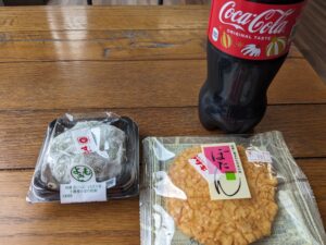 下山後はお決まりのコーラ。売店で売ってたおせんべいと豆大福と一緒に。名物なのかはよくわからなかったですが、体が欲してたので。