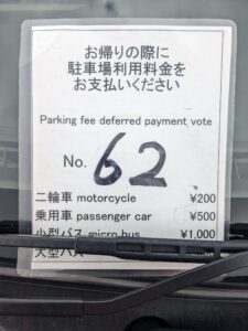 なお、車に戻ると早朝駐車料金を払えなかったのでフロントガラスのところにラミネートされた札が挟まれていました。どうやって払うのかと思ってましたがこういうシステムなんですね。